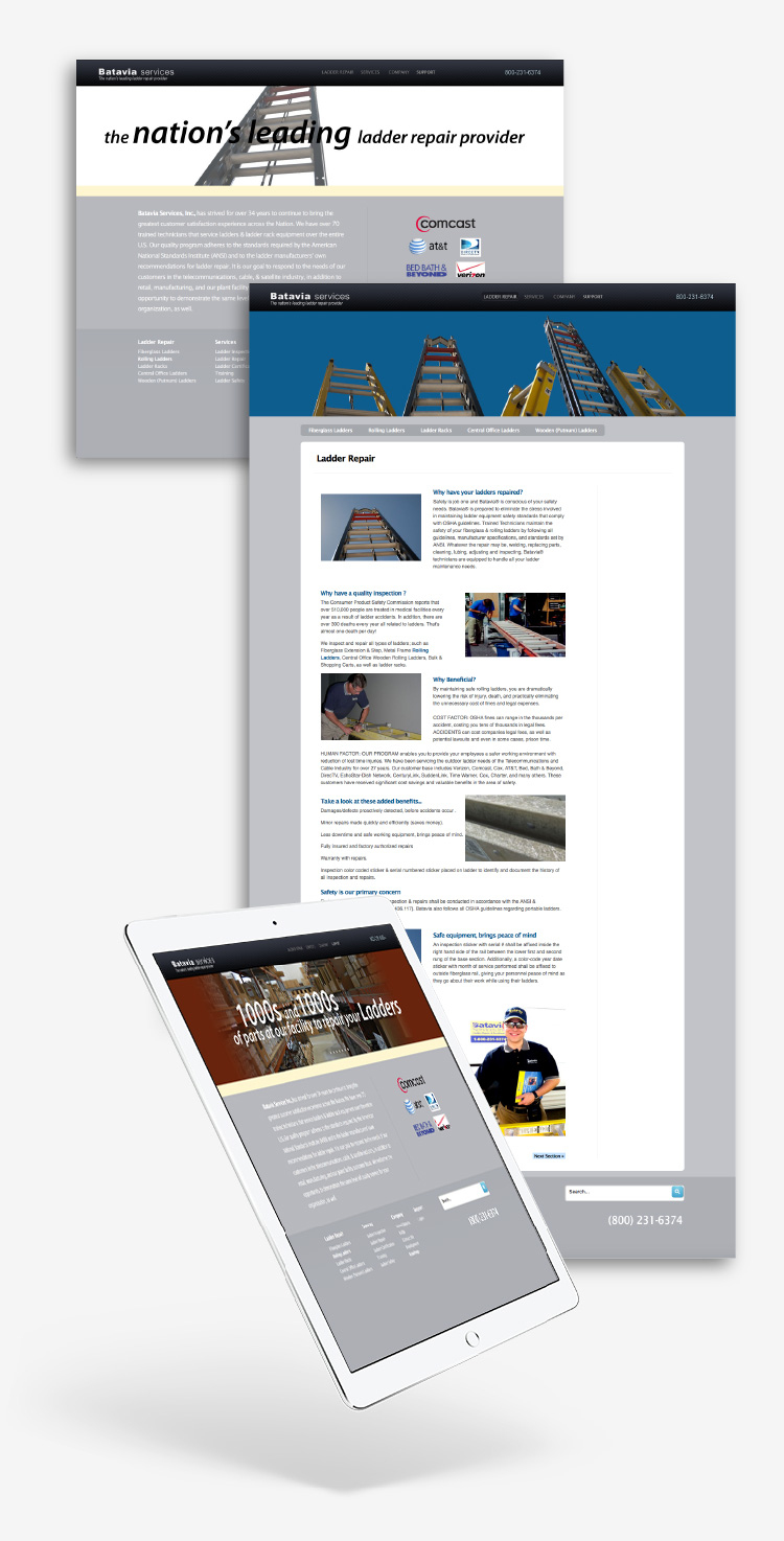 We designed and implemented a new customer facing website for Batavia Services, Inc. With over 70 trained technicians that service ladders & ladder rack equipment over the entire U.S., their site is the conduit for sharing information with their field technicians and clients. They service customers in the telecommunications, cable, & satellite industry, in addition to retail, manufacturing, and their plant facility customer base.